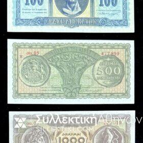 100 – 500 – 1000 Drachmas 1953 Set of three Banknotes Kingdom of Greece issue B UNC