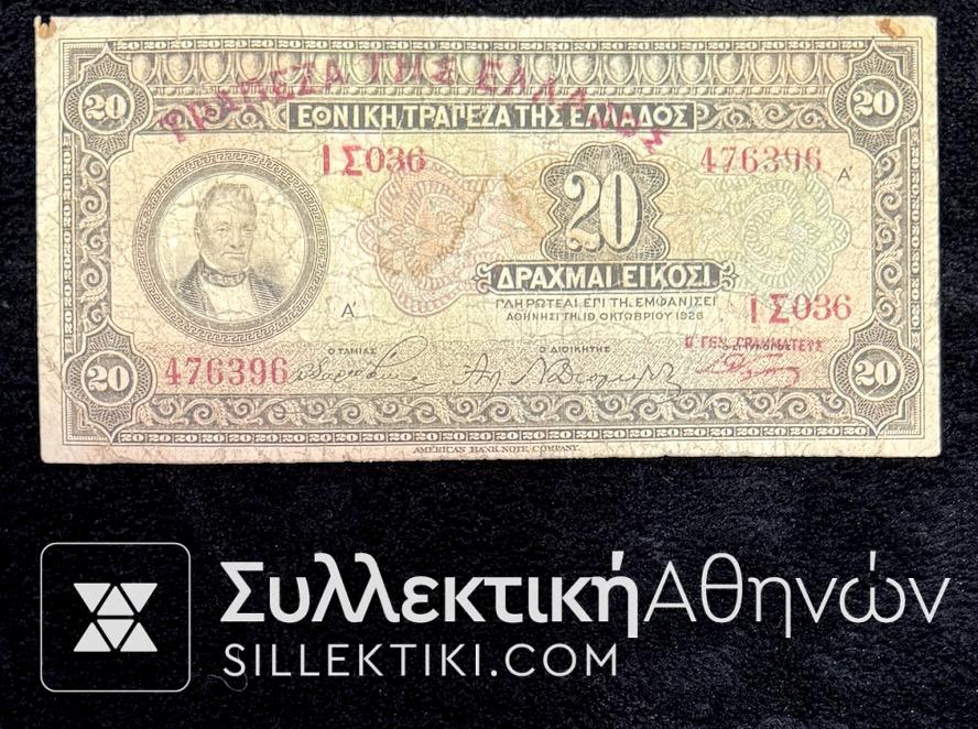 20 Drachmas 1926 BANK OF GREECE / NATIONAL BANK VG