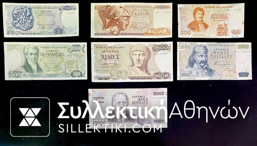 ΣΕΤ Πλήρες (7 Τεμάχια) τα τελευταία Ελληνικά Χαρτονομίσματα Δραχμών σε σχεδόν ακυκλοφόρητη κατάσταση (AU)