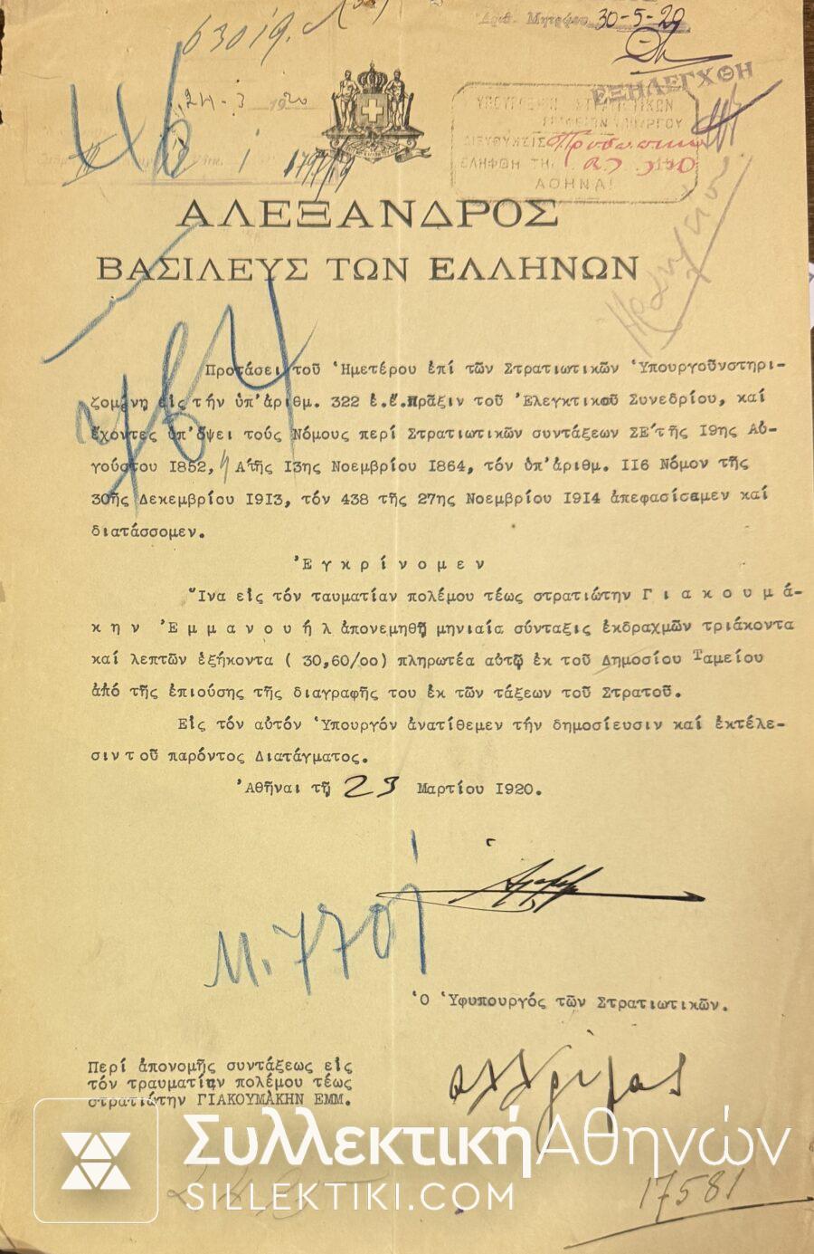 Φέρει τις υπογραφές του Βασιλιά Αλέξανδρου και του τότε υφυπουργού Στρατιωτικών .