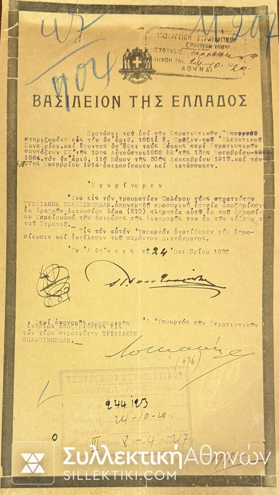ΒΑΣΙΛΕΙΟΝ ΤΗΣ ΕΛΛΑΔΟΣ 1920 Σπάνιο Έγγραφο 1920 για απονομή σύνταξης σε τραυματία στρατιώτη των Βαλκανικών Πολέμων.