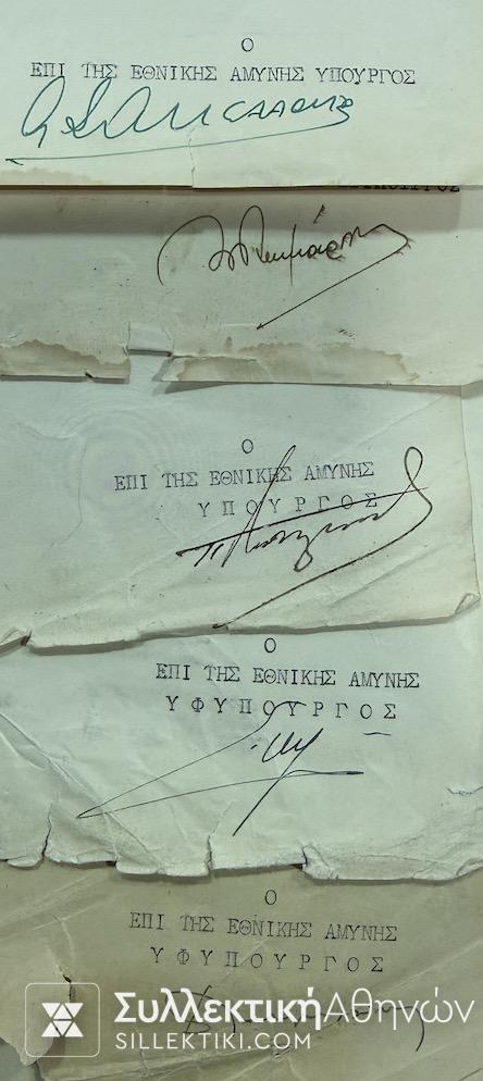 5 ιστορικά έγγραφα εποχής Βασιλέως Παύλου με 5 διαφορετικές υπογραφές από τους εκάστοτε υπουργούς και υφυπουργούς Εθνικής Αμύνης, υπογραφή της Βασίλισσας Φρειδερίκης και (σφραγίδα) υπογραφή του Παύλου.
