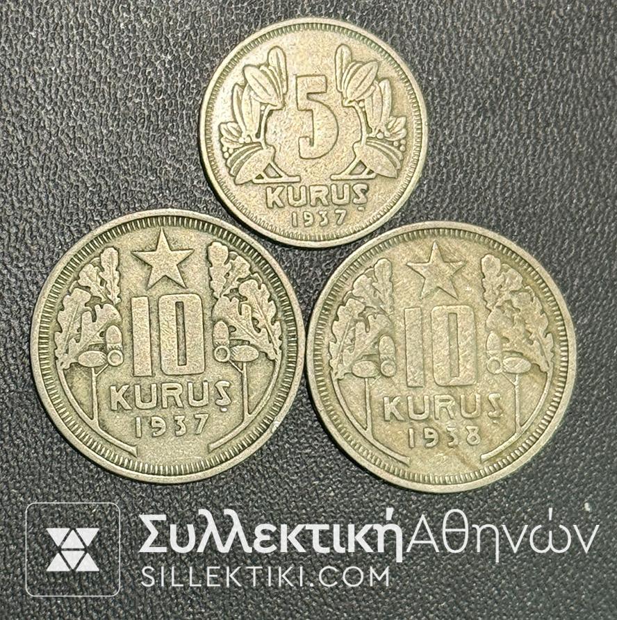 3 Νομίσματα Τουρκίας 5 και 10 Κουρούς 1937 και 10 Κουρούς 1938 VF