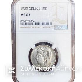 10 Δραχμές 1930 (ΔΗΜΗΤΡΑ) Ασημένιο νόμισμα άριστη κατάσταση με λούστρα ακυκλοφόρητο. Πιστοποιημένο Ακυκλοφόρητο από την εταιρία NGC ως MS63