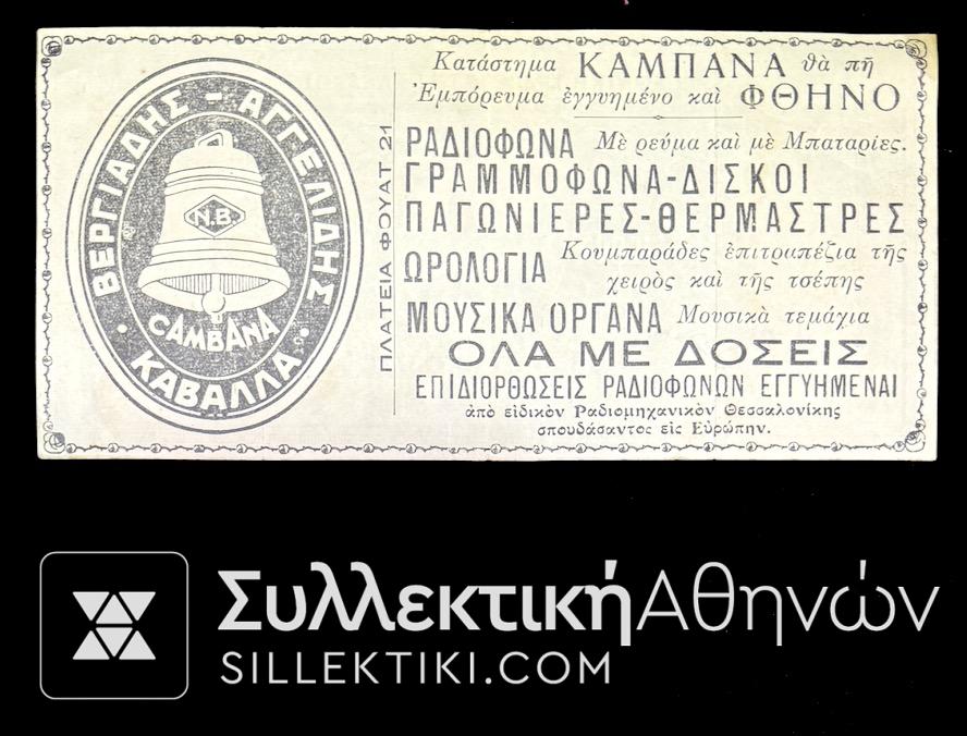 1000 Δραχμές Πολύ παλιό Διαφημιστικό “ΚΑΜΠΑΝΑ” Θεσσαλονίκη “Εμπόρευμα φθηνό και εγγυημένο” Παδιοφωνα με μπαταρίες και ρεύμα . ΠΛΑΤΕΙΑ ΦΟΥΑΤ 21 ΚΑΒΑΛΛΑ”