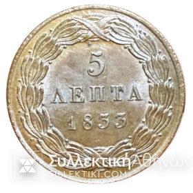 5 ΛΕΠΤΆ 1833 ΒΑΣΙΛΕΙΑ ΤΗΣ ΕΛΛΑΔΟΣ Εξαιρετικό Νόμισμα Εποχή Όθωνα με τον θυρεό με την κορώνα